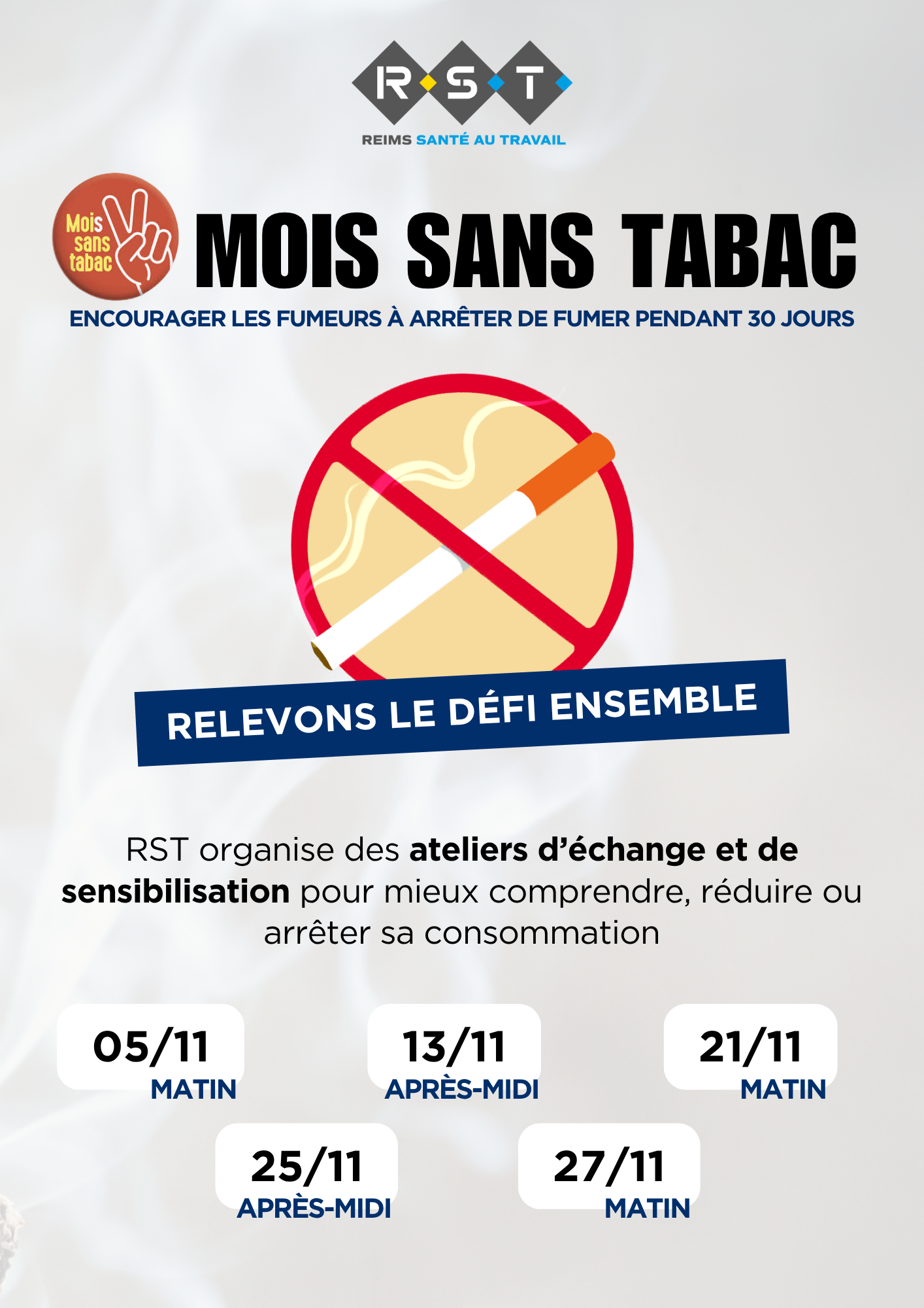 Dans le cadre du mois sans tabac, Reims Santé au Travail vous propose des ateliers d’échange et de sensibilisation avec notre Infirmière Laboratoire et nos IST.